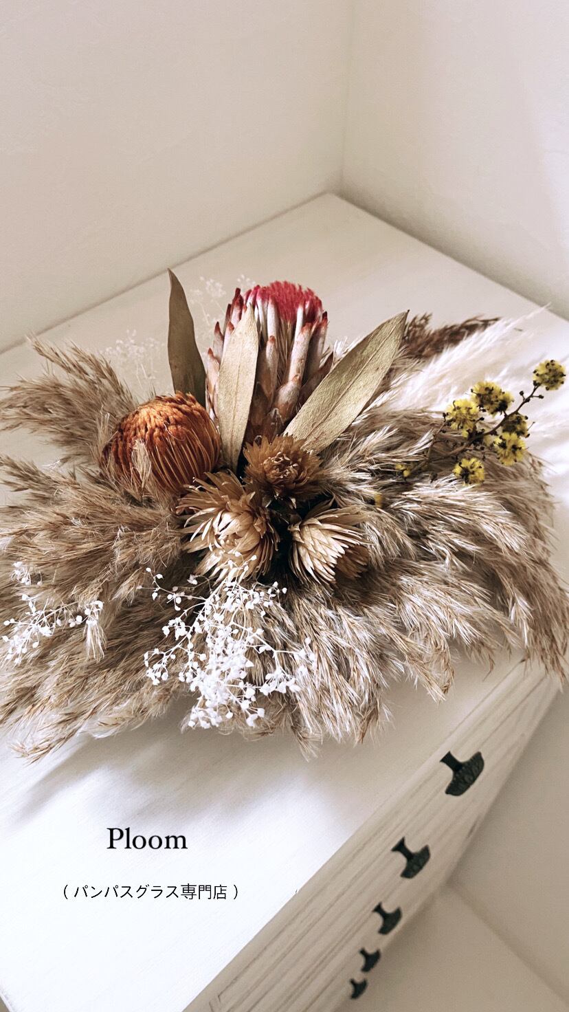 パンパスのブラウンと挿し花の深いレッドとオレンジがポイントで、暗くなりすぎず落ち着きあるけれど華やかに仕上げました。